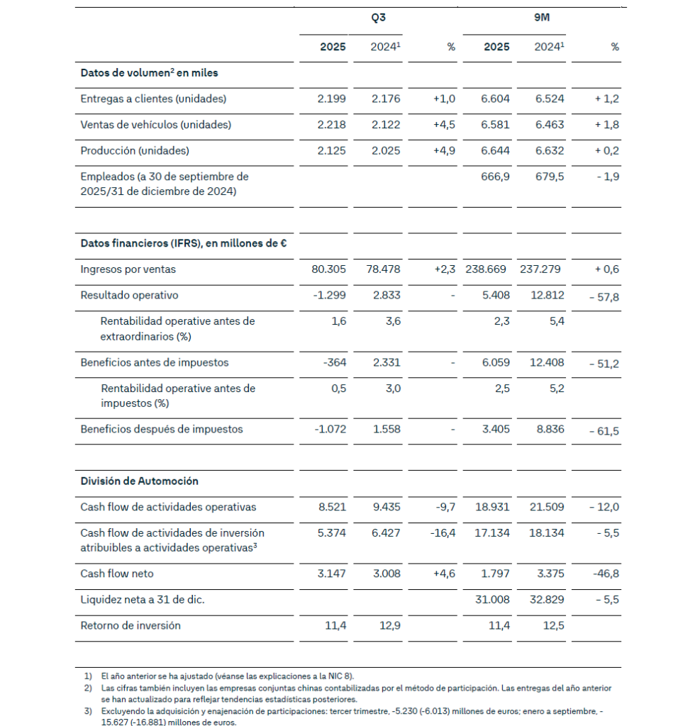 1.800 millones de euros de cash flow neto en la división de automoción en los nueve primeros meses de 2025 (nueve primeros meses de 2024: 3.400 millones de euros)